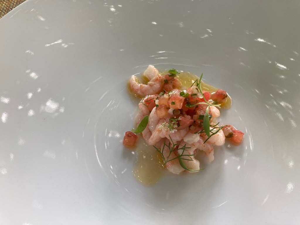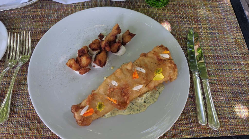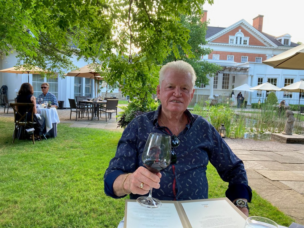 Disappointed that we had to cancel three summer trips, I decided that we should do some one or two day trips here in our province of Ontario. Langdon Hall is a glorious country house hotel about an hour from our home in Toronto. I booked two nights there and found a terrific package for this Relais et Chateau property. We hadn’t visited there for years. In fact before we were married I invited Charles to come there as my guest ( I had some sort of voucher) and it turned out to be the opening week of the hotel. It was before Christmas and it became my gift. As I recall, (it was over 33 years ago), the place was spectacular. We have visited many times over the years, but it had been a while. So I booked us and got a deal with two nights, two dinners and breakfasts, and if you know the food at Langdon Hall you would know what a treat that was. We arrived late August on a sunny warm afternoon. Because of Covid, I had to book the specific times for all our meals, although they were served outside in their gorgeous gardens. Lunch was for me shrimp, smoked trout, two appetizers, while Charles had delectable fish and chips. We drank some rosé because after all we were on a holiday.