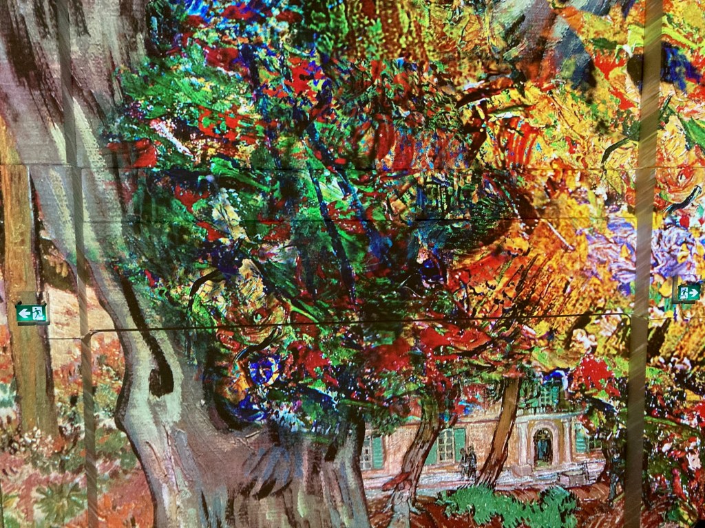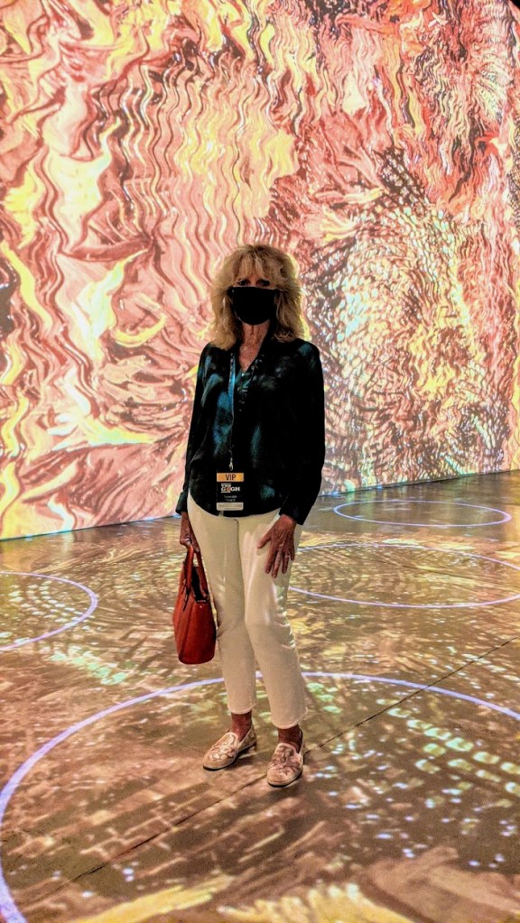 Meanwhile we have had a wonderful summer. One of the highlights was our visit to Immersive Van Gogh, an unusual presentation of Van Gogh’s art in a huge warehouse complete with very loud, but marvellous classical music to match the paintings that were projected on the walls. I had bought the tickets online for a May visit, but then with Covid they got changed to August. The exhibit was very organized and we were taken in right away because of course I had purchased VIP tickets. The large factory space had circles on the floor that you were expected to stay in while you watched the walls perform. There was also a raised platform that you could access for about 10 minutes. Many of Van Gogh’s paintings were moving on the walls and they truly became alive. I wonder what he would have thought of this. There were descriptions of the art and stories of his unusual life. Charles and I had visited his home town in Arles, France, about a year ago, and remembered much of what we were told while we toured. The entire experience lasted just over 30 minutes, although I guess you could stay longer. We loved it.