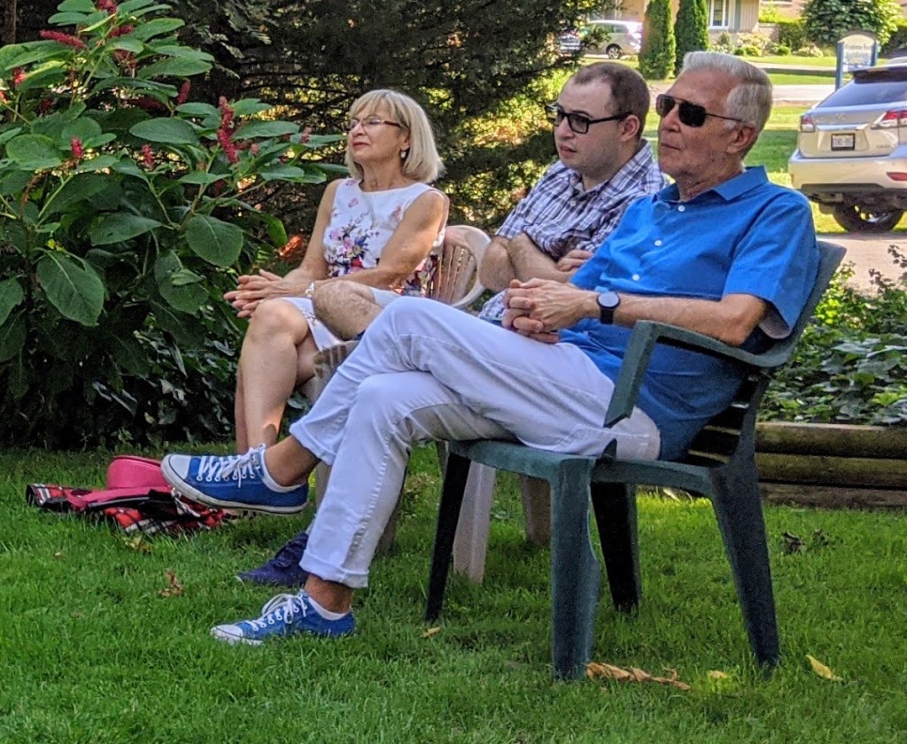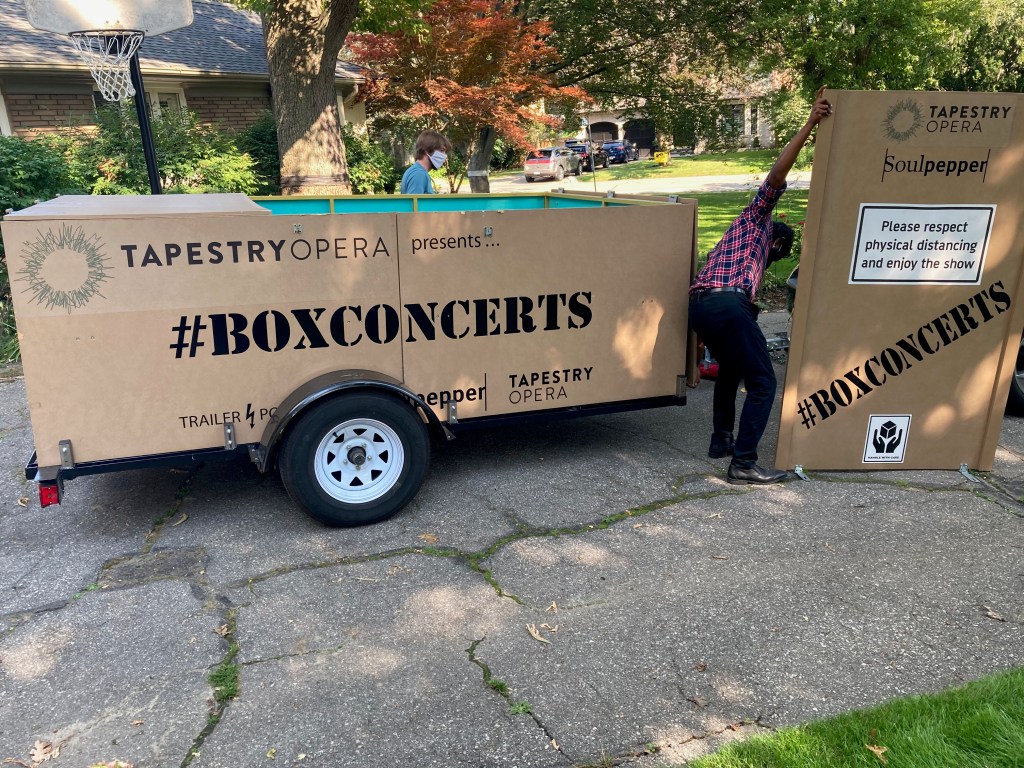 I recently read an article on the editorial page of our national newspaper by a stripper or rather exotic dancer , who said that she really missed the dancing and performing, and couldn’t understand why the bars were closed during this stage of our recovery. How ironic. She missed performing! And there are all our well trained artists of the dramatic stage, opera, concert, musicians, many who have been studying for years not able to work. Yes, they have been appearing online in free concerts, but it just saddens me tremendously for them, not to mention the young artists on the brink of careers. So I was delighted with Tapestry Opera Theatre who started an initiative primarily targeted for long term care homes, that sent a travelling stage in a box complete with an opera singer, to perform a short concert. I immediately hired this travelling theatre act, and with my pal, Sharon, who offered her home as a back drop, invited some friends to come and enjoy the performance. And it was very enjoyable indeed with the wonderful young Sri Lankan/Canadian tenor, Asitha Tennekoom. They offered as well a concert with a cellist. Asitha arrived on a sunny Sunday afternoon with an other young man who helped put together the stage, and who drove the truck. It was brilliant. Bravo to Tapestry Theatre and Soul Pepper Theatre who created the box.