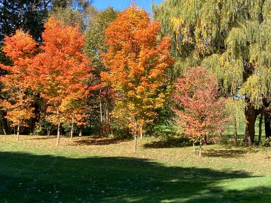 I should mention some of my favourite things, because we are now looking closely at our live’s little things during these Covid times, and we are home a LOT. I simply love the new carpet on our stairs. The thirty-five year old carpet that was there was starting to look pretty worn, even though we mostly live downstairs in our home, except for our offices. I priced three different carpet places and only one was reasonable, from Dundas carpet. I couldn’t believe the first estimate of $8,000!!! for 15 stairs, then I had one for $4,000, still too much, then finally $1,500 which was definitely doable. And I love it. It is so bouncy, with its new under-pad, not to mention good looking. I simply like walking up and downstairs. Go figure. Life’s little pleasures. I also like our new toilet seat, talk about glamorous things. It just sets itself down very quietly and softly. I did enjoy smashing the old one down, but this is magical. Tells you how much we are staying at home and going a bit crazy. I also love the trees changing. The colours are remarkable. I am really appreciating the fall and taking many walks. I am watching our bird feeder more, and that is very exciting- ha ha, but I do love my cardinals and now the robber nuthatches, who are little piggy eaters for their size. I could go on, but I wouldn’t want you to get envious of my special delights. I did forget to mention the fires in our fireplaces. We actually have three in the house, but the basement one is not on our agenda. We have a small one in our bedroom and one in the living/dining room. We have wood for the winter which is neatly stacked in the garage. So every night we have a fire. The smell is incredible and the glow is so satisfying. I can’t imagine having a gas fire and deriving as much pleasure from it as ours. Best to remember to open the flue when starting, though, and to close it afterwards if you don’t want cold air rushing in.