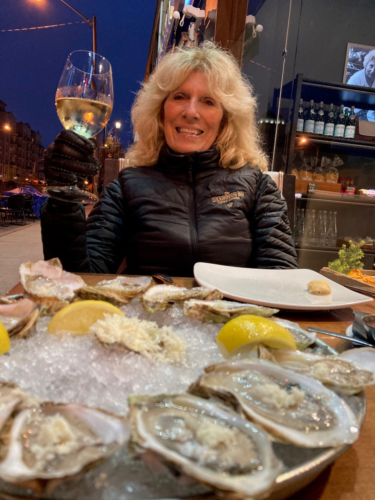 After a nap, we dressed for dinner outside. It was a warm night and the place was decorated beautifully with pin lights that lit up the trees and pond. It was a fairyland. There were many tables, but social distancing was respected. We had amazing scallops, 45 hour beef which meant it was brewing that long, and yummy chocolate pudding. All perfect.