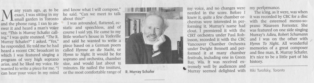 Meanwhile as so often happens now that we are older, another colleague has passed away. The great composer, R. Murray Schafer died recently and I wrote a small piece for our national newspaper, The Globe and Mail called “I Remember”. I will add it to this blog as a tribute to Murray.