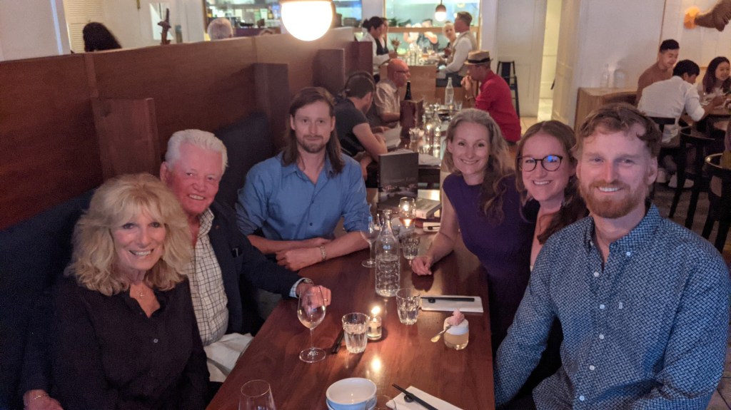 Charles and I had our usual afternoon nap while the family Petersen went to their home to regroup for dinner later. Sway went to her first sleepover at a friends’ house, and Corby and Kate as well as Niels and his girlfriend, Charlie, met us at Pidgin, a very trendy restaurant in a shady district of Vancouver, and I don’t mean with trees. Lots of druggies and vagrants sleeping on the sidewalk, but amazingly lots of high end restaurants in the neighbourhood. You kind of just step over the dirt etc., and enter the establishment. We were warmly greeted and served extremely well by a very knowledgeable waiter. We all had some drinks and settled in at a long table and shouted at each other. Of course so many restaurants now are noisy, which I assume is to give energy to the surroundings, or to get you out of there quickly. We ordered the tasting menu to share that had many dishes that were very good, some unrecognizable, drank too many bottles of wine, and decided to take a mortgage out on the house to pay the bill. All good though as how often do we see our kids.