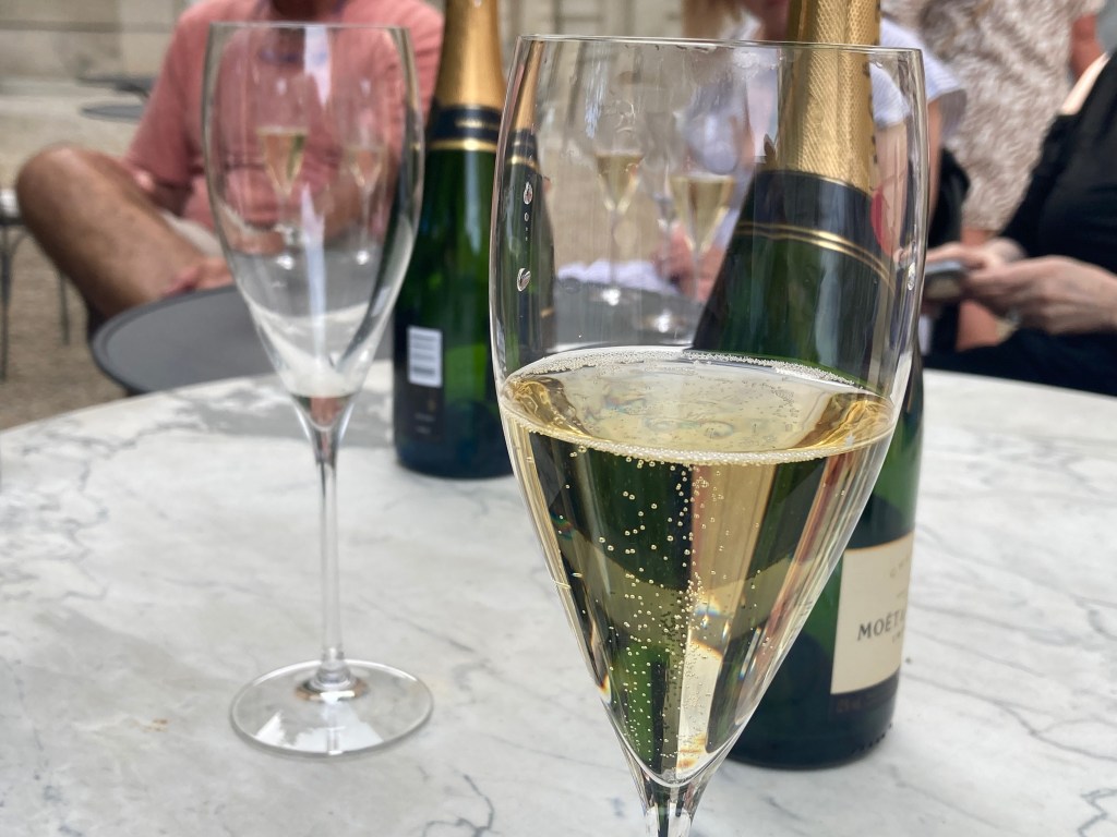 After that visit we relaxed on the deck, cruised through villages and the countryside on the River Marne. Dinner on board delicious with hen, and much conversation. Turns out two of the guests had their guitars, and one of the crew also played. I had my voice so we made some music together. Paul, the doctor, was learning the instrument, Bruce was very good, and the crew member fine. Champagne before dinner was a precursor to our next day’s visit to the famed Moët et Chandon champagne house in Epernay. I had visited many years before, about 40, and had memories of a garden. They were pretty good memories as it turns out. We sampled a few different vintages, and we were treated very well. If you have been following my blog over the years you will know that I adore champagne.