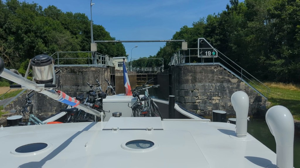 The thing about a barge trip is its ease of travel, for the passengers that is. You float along silently, sharing the canals and rivers with swans, and ducks, and it is almost like a floating cottage. The deck had comfortable lawn chairs and everyone had a view. From time to time we went through locks, and when we stopped it was easy to get off and wander into a nearby town, take a bike for a ride, or just walk from lock to lock and meet the barge. Drinks were always available, and as I mentioned earlier the food was delicious. The problem of excess loomed, but then we were in France…