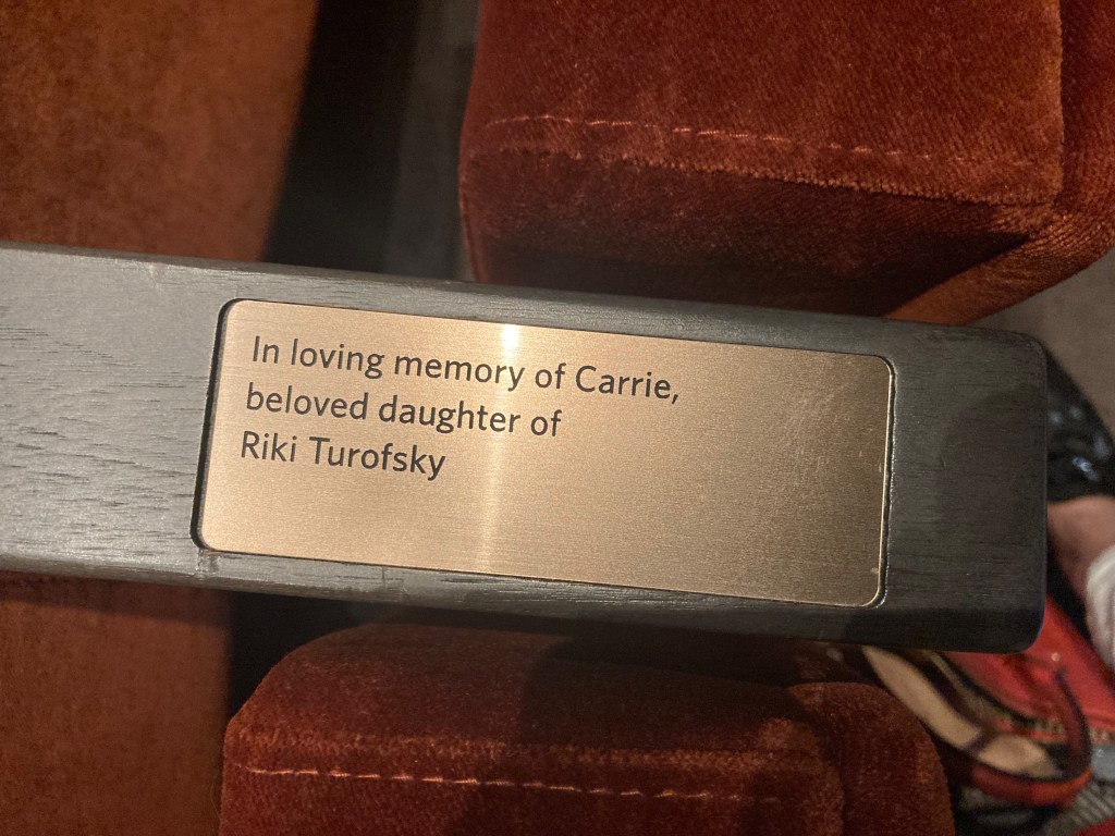One very spiritual occurence took place. We were part of a group who supported the building of the Tom Patterson Theatre. One of the things we did was endow a seat in my daughter’s memory. When we were in the theatre watching Horseman, I wondered where her seat was and asked the ever helpful development officer, Rachel, for the seat number. We returned to the theatre for the Richard performance, but hadn’t yet received the seat number. I settled into my seat and looked down at my arm rest and there was the little plaque for Carrie. I was thrilled and couldn’t believe the chance of that. I also was probably the only one taking a picture of an armrest. It was a good good moment and made me feel that my Carrie was close by.