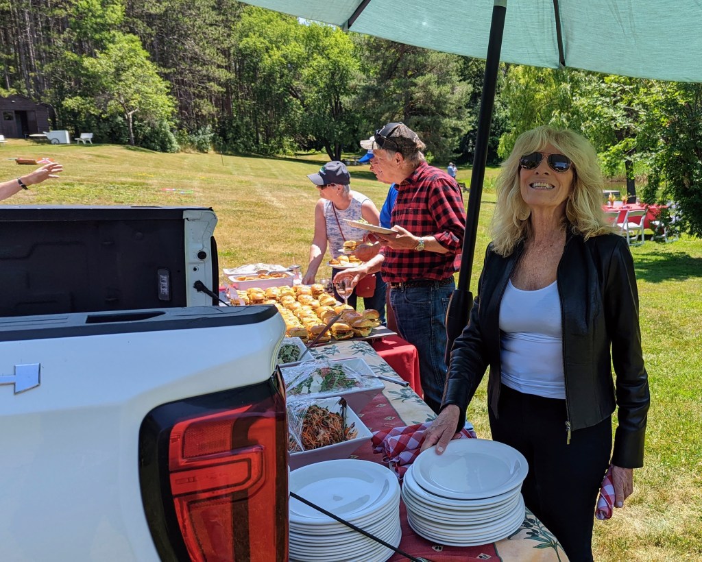 One other visit to the Festival included a celebration for my sister’s birthday. We had postponed this because of Covid and decided to treat her and her man to a matinee performance of Chicago and a sumptuous dinner afterward at The Bruce Hotel. They kindly made a special menu and sealed it with wax. Everything was delicious especially the halibut crudo and the steel head trout terrine. Then Malcolm, my sister’s man, organized a party for her at her farm with the theme Keep on Truckin’. We all arrived in truckin’ outfits, well sort of. I was dressed as a trucker’s babe. It was a beautiful day, and the farm looked splendid. The food truck was open in the back and it turned out to be a tailgate event. Lots of goodies, sliders, fish and chips, and an ice cream man for dessert, well not the man, but his goods. Yummy. Lots of laughs and glee. There was music too. All good!