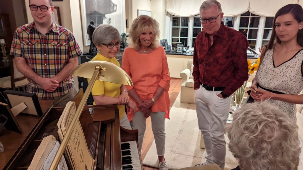 There was one very special evening in the summer. Our neighbours had a young Ukrainian refugee living with them and we got to know this very smart, well spoken young woman, Sasha. Well spoken in English which is amazing, and she had already found a job when she arrived. We invited her for dinner with our friends, the Ouzounians, and another friend and colleague who we ran into at a local restaurant. We ate outside and I had somehow miscounted our numbers and prepared for only 6 guests. We were seven. We quickly re- arranged the table and cut our duck confit in half and divided everything else. Charles and I would share. Now our guest, Che, is a fine pianist. She had been a professor at the Faculty of Music, but was now retired. There was lively conversation and after dinner we went into the living room and Che sat down at the piano and started to play It’s a Wonderful World and we all gathered round and sang. Little Oscar loved it, and jumped up on the piano bench bedside Che and started to play. It was hilarious. If you don’t know, Oscar is our dog and loves the piano. He wasn’t great, but he added laughs to the evening. At a later date, I invited our neighbours, Evan and Christine, and Sasha’s boyfriend, Roman, to Rosh Hashanah dinner. Lots of honey for the New Year and all was well.