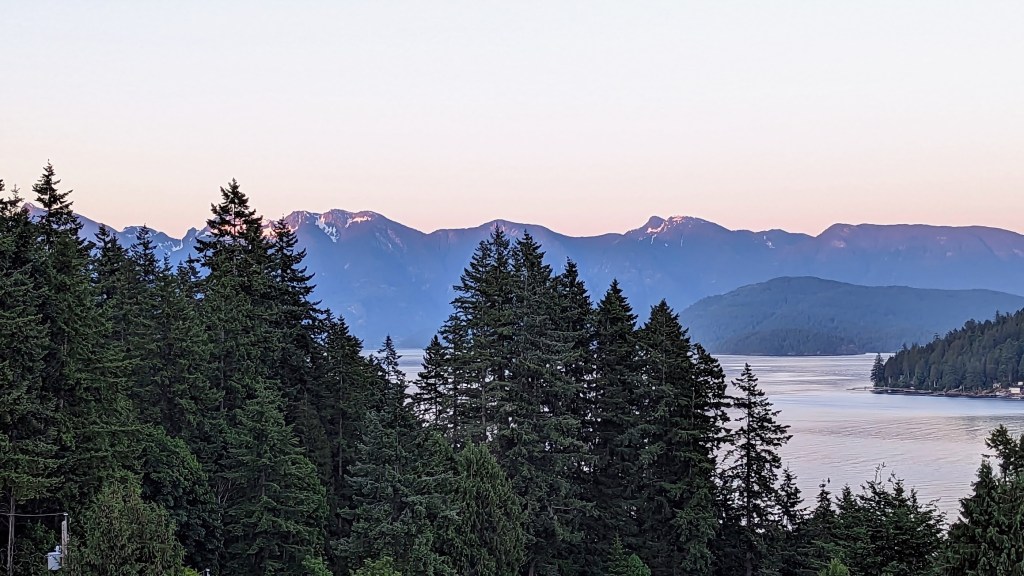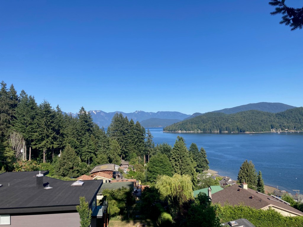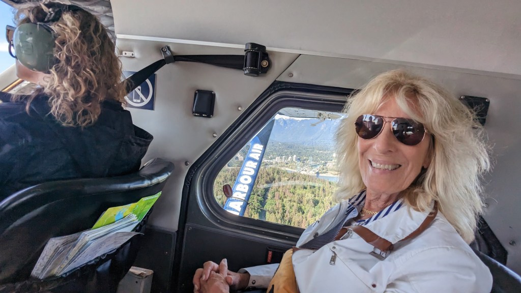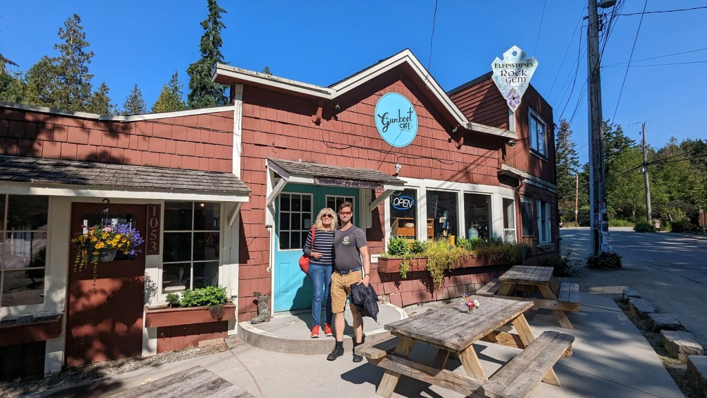 Our seaplane flight to Gibsons Landing was just fine and we landed to see Niels waiting with more hugs. Love those hugs. We actually landed in Sechelt, a small coastal town about a half hour from GIbsons and drove to a Mexican restaurant called Lunitas, https://www.lunitas.ca that was outdoors and terrific. Then Niels took us to our Air B& B that was extremely gorgeous, with magnificent views of the mountains and sea, and decorated with excellent taste, top of the line appliances, and a very comfortable bed with a deck and fire table. The living room and dining room and kitchen all had views. We didn’t have a car so we walked down into the town to find breakfast at a small cafe called The Black Bean. Had a yummy breakfast, and then went walking towards the town of Lower GIbsons and we found an amazing shop where I bought quite a few unique tops. I was thrilled. Then we headed to a small store for soup and spring rolls to take back to our place with a few basics for dinner on Thursday, fresh fish, and just out of the ground carrots. We waited for Niels to pick us up.