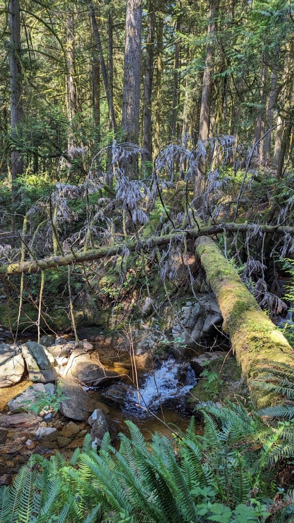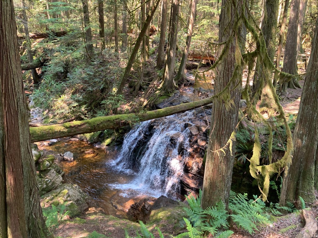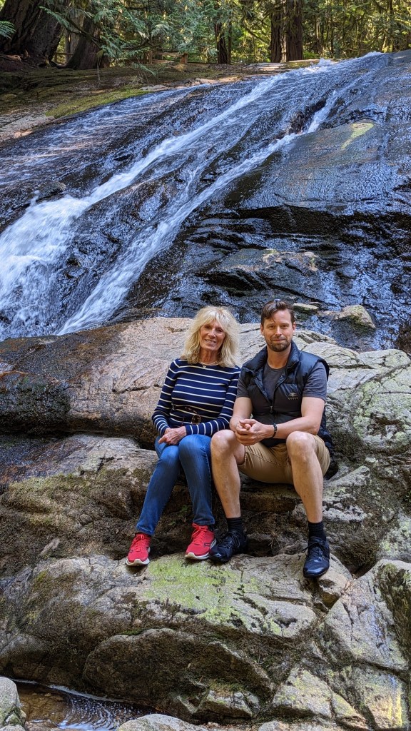 After our glorious nap, some champagne on the deck with Niels, we headed to a restaurant called Drift and ate outside. We shared ceviche and had some yummy entrees. The next day was our anniversary and Niels picked us up for breakfast at the Gumboot Cafe in Roberts Creek. It was delicious and very vegan. We sat outside and looked at the hippies it seemed from a different era; our era. Then what was the tour de force of our day , a visit to Niels’ favourite forest, The Cliff Gilker Park. This incredible land had two marvellous waterfalls, many trees, that Niels told us about, and we learned that dead trees keep on giving in a forest. They are called snags. Much forest life keeps growing on dead trees and adding to the environment. ‘Dead trees provide vital habitat for more than 1,000 species of wildlife nationwide. They also count as cover and places for wildlife to raise young in the requirements for Certified Wildlife Habitat designation.’ We spent a few hours in this park and felt exhilarated.