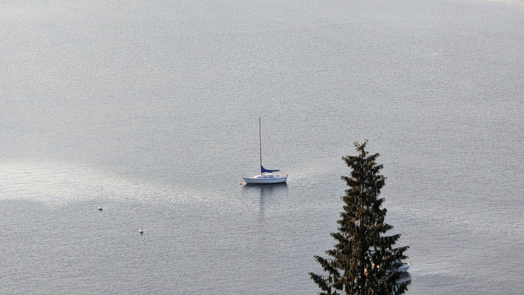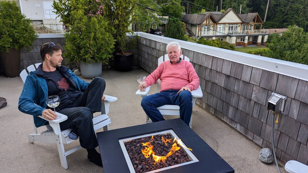 After we were back at our place I had the brilliant idea to walk from our fairly high spot down to the beach below that we could see, except that you couldn’t access the beach. It was hot and we had to walk back up a very steep incline/hill, but we made it and relaxed before dinner out at Smitty’s Oyster This was our dinner a deux and we had a super time. The place was on a pier by the water. The food scrumptious, and we were offered some bourbon as an after dinner treat. We had come in a sort of Uber called West Coast Rides, but didn’t book a return. Thankfully Niels came to the rescue as there are few taxis in Gibsons. Wonderful anniversary although Charles fell out of bed during the night . Apparently, he was in some sort of crazy dream. He wasn’t hurt thank goodness.