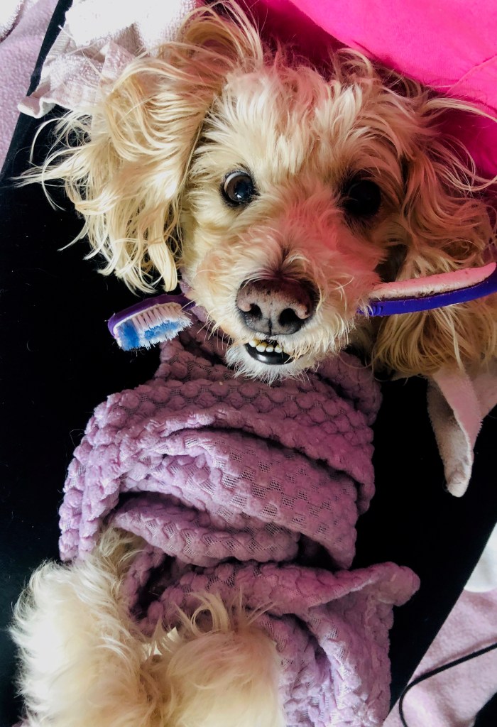 Back in Toronto reunited with Oscar, who was booked to have his teeth cleaned without anaesthetic, just swaddled in a blanket with the experts from Kissable K9 Care. I think he actually liked it. It is a terrific service and I have it done twice a year. Mine too, but at my dentist ha ha, and no blanket.