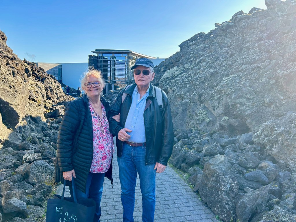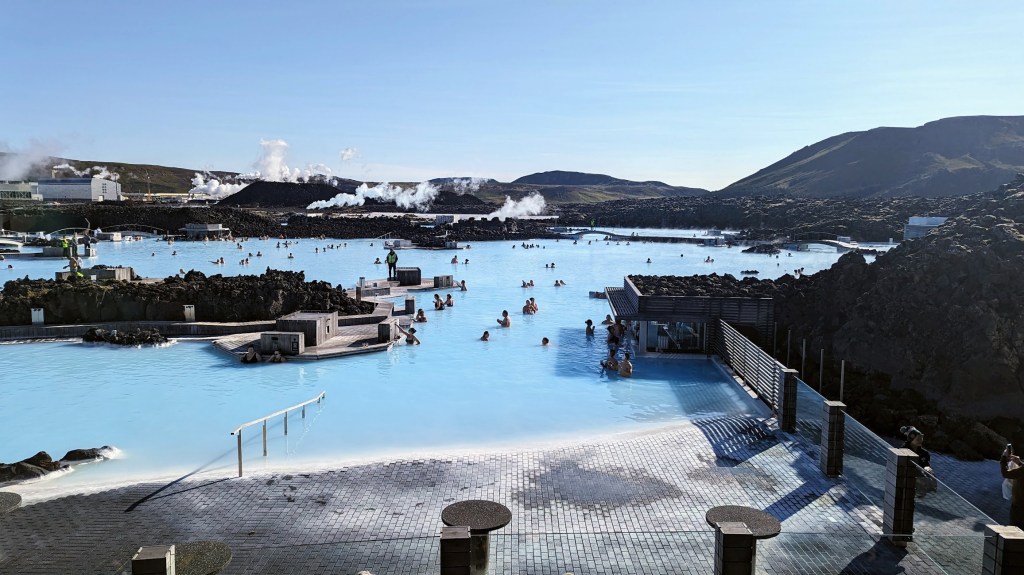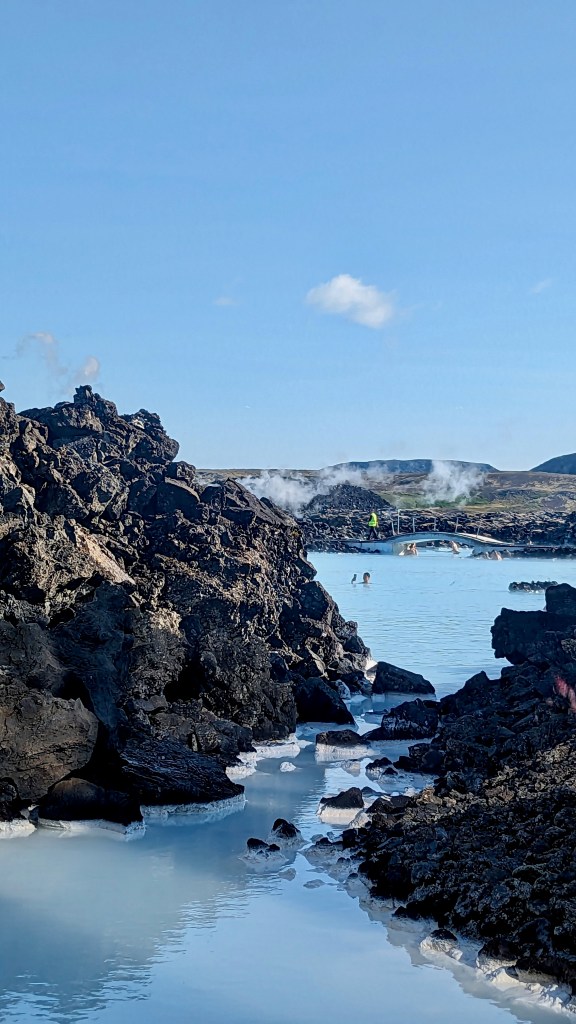 The hotel had a restaurant that served a lavish breakfast buffet, but we preferred the tiny coffee bar off the lobby, where they served croissants and cappuccino, and juice for me. That second morning we were scheduled to go to the famous hot springs of Blue Lagoon and it was a perfect day for it. We had booked Said to drive us, and with his large comfortable car the trip went by fairly rapidly. I just read now that it is temporarily closed because of the volcano erupting, so we were very lucky indeed to go when we did. It is a fabulous experience. One that I will never forget. The lagoon is massive and the sky was clear, the air cool, the water very warm. Pam had purchased the VIP tickets, which included, locker room, terry robes. showers etc. When you step into the water it is simply wonderful. You basically don’t swim, but float around. You can get a masque for your face of the minerals. We all passed on that, but we didn’t pass on the wine that came included and floated over to a wine bar. The sun was very warm on our faces, the air cool. Yes! We listened to a talk about the springs and its history.