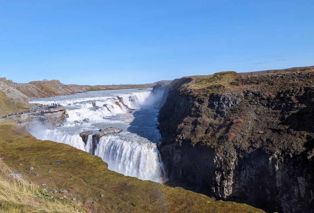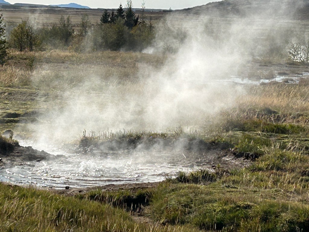 That night dinner was scheduled for the Fish Market in a very old house. Not sure where we got our appetite, but we had lots of fresh fish; sashimi, oysters, and a lobster California roll. The next day we had a different driver that Pam had booked before she left North Dakota, but Said was booked to take us back to the airport on our departure, so we would see him again. We really liked him.We were scheduled to do the circle drive tour. This took us to the ancient Parliament, the geysers, and the famous Gullfoss waterfall, and most interestingly to the Tomato farm for lunch. That was unique! We arrived at the farm and the place was packed with lots of people waiting for tables. We went to the bar and stood very close to folks who were eating, and we hoped finishing their lunch. Kinda of reminded me of the days as a child when my mother took me to the Honeydew restaurant downtown and we stood behind people at the bar waiting to take their seats. Not subtle, but it worked, and was expected. At any rate we talked to these folks, and it wasn’t long before they were finished and we took their bar stools. Everything in the restaurant was made with fresh tomatoes from their vines, which by the way were everywhere. We started with a bloody Mary, made with fresh tomatoes. Simply delicious and different. Then we had the soup, again fresh tomatoes, tomato ice cream, and tomato cheese cake. All yummy. It was such fun. After lunch we visited the geysers. They were spewing. I assume that now the volcano is far more impressive. The waterfall very Niagara for us Canadians, and very windy there. I almost was toppled by the strong breeze.