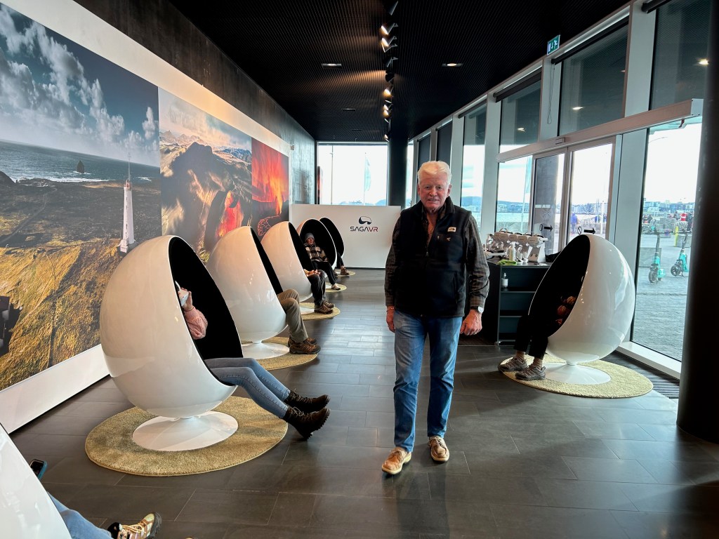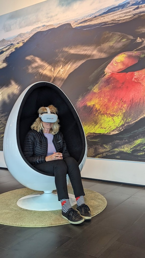 We had a late start the following day and decided to walk and tour around. We went to the stunning arts centre called Harpa which was really only a few short steps from the back door of the hotel. The architecture was beautiful from the inside and out. There was a small store inside that had a virtual reality centre called Experience Iceland from above with individual seats that moved around, and four shows. I was a bit worried about my vertigo problem, but was assured by the lovely lady who ran this that I would be fine, and she was right. It was an incredible show. And she gave me a wonderful ginger mint at the end. I then went in search of these Barclays mints to get a supply for home. I love them and they settle my stomach. There was also an art exhibit and a store. Hanging on the wall was a sheepskin vest that Charles decided was me, and he purchased it. I love it, and would never have bought it for myself. We all bought some souvenirs to take home for gifts.