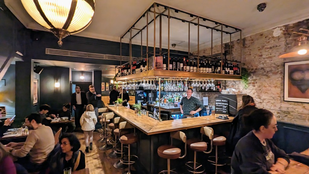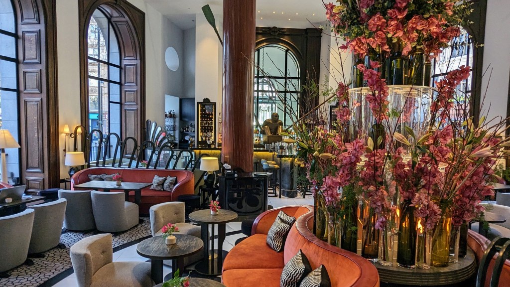 After they had short naps and long showers we went downstairs for dinner in The Lobby Bar. I knew we would all be too tired to head out, and I was right. I pre-booked all our meals as London was busy at this post Christmas time of year. I also had to guarantee every reservation with a credit card. I love finding places to eat on google and also got feed back from the concierge. One Aldwych is a new old hotel. It was first built in the early 1900’s as the home of The Morning Post newspaper. This was in 1909. The building was sold, and became a hotel that is independently owned, and opened in 1998, later renovated in 2019. It is beautiful and unusual because the architecture is not square or rectangular, but curvy. So the rooms have unique shapes.