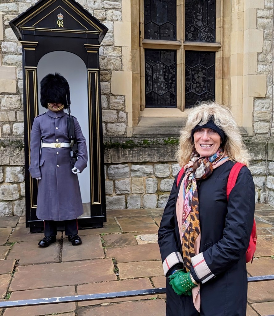 We then walked to Buckingham Palace. Sway hoped to see King Charles, but he was not in residence as we could tell from the flag that was flying. We walked through St. James Park where the ducks and Moorhens, well fed by the Royal caretakers were waiting, and the famous pelicans whose wings are clipped so they will hang about the park. Then we took The Tube to the Tower of London. It was fun to travel underground with Sway where we got to see a non luxurious slice of life. All part of the education. Amanda traveled with us and we arrived at the huge site of the tower, where I had booked our tickets to see the Crown Jewels as part of our visit. The grounds are enormous, and the tour inside to hear about Ann Boleyn and the rest of the prisoners was captivating. I do hope you check out the hyperlinks I have provided. They expand in detail on all I am telling you. The tour through the Crown Jewels was definitely a highlight, so much so that Sway and Corby spent about 15 minutes more than the rest of us checking it all out. We stayed outside after our visit and drank mulled wine to keep us warm while we were waiting for them. We also saw the famous ravens, Poppy and Jubilee. Lots of tales about these two, and the Raven that escaped from an enclosure during Covid.