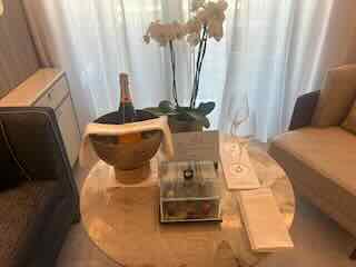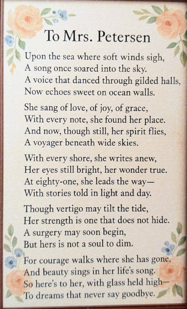 One extraordinary thing happened on our last evening. Ann to whom I gave my card looked up my blog and myself on the web. On the last evening we ate in Tides. In fact an invite was delivered to our cabin requesting our presence. Turns out we were the only invitees and when we arrived at our table it was strewn with rose petals and there was a gorgeous floral arrangement in the centre of the table. Not only that but the cutlery and dishes were gold. There was a poem that Ann had written and a card signed by the staff of TIdes that was a homage to me. As well a QR code on one card that took us to a site where all many of my performance pictures were shown. We were absolutely bowled over. She even arranged for an Opera cake to be baked for us by the chef, researching the ingredients online. I have the card and will try to copy it so you can read her delightful poem. I believe she thought I was some sort of star and that was her way of thanking me. Ann, from Kenya, will never be forgotten.